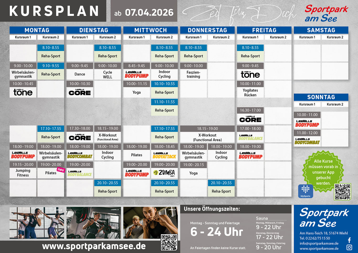 Dazu kommen zwei große Kursräume mit rund 40 Kursen pro Woche, von schweißtreibend bis entspannend – ergänzt durch Reha-Sport für gesundheitsorientiertes Training.